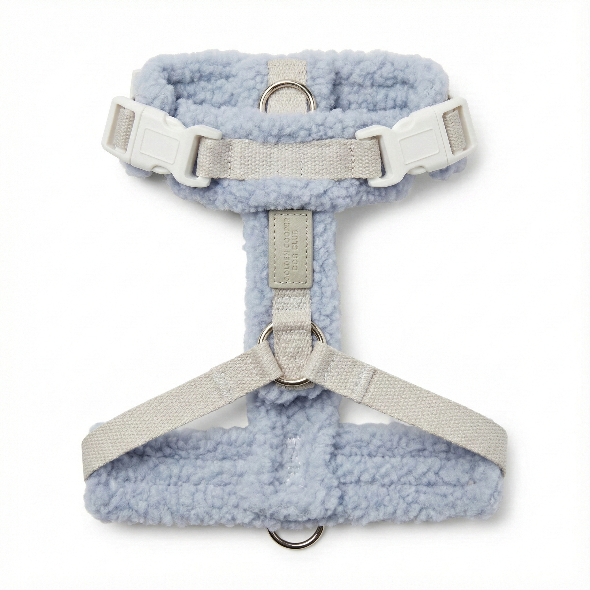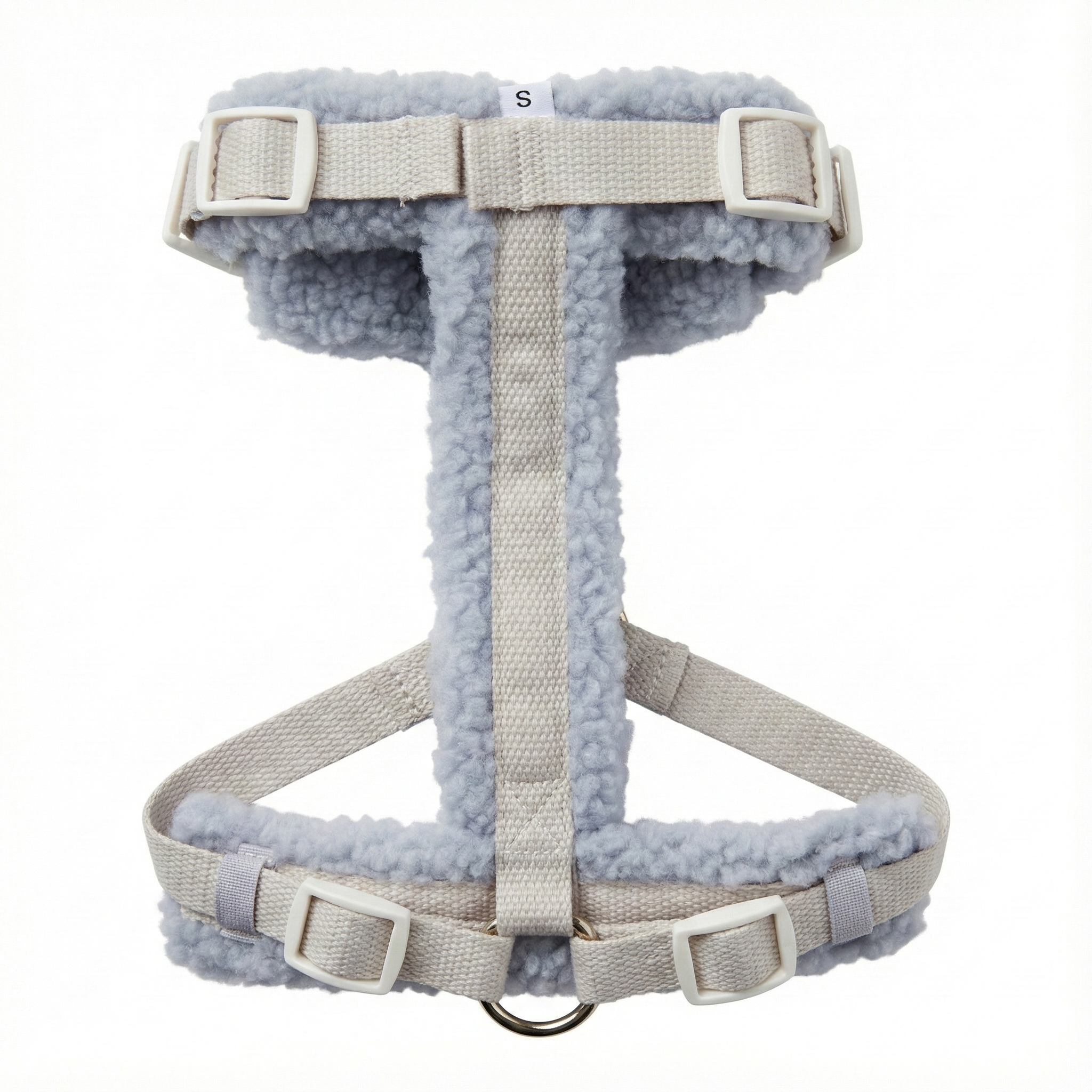 Arnés estilo H diseñado para el máximo confort en invierno, con un suave revestimiento de tejido de borreguito color crema y correas de nylon ajustables en tono taupe (marrón-gris). Ideal para prevenir rozaduras en el pelaje.