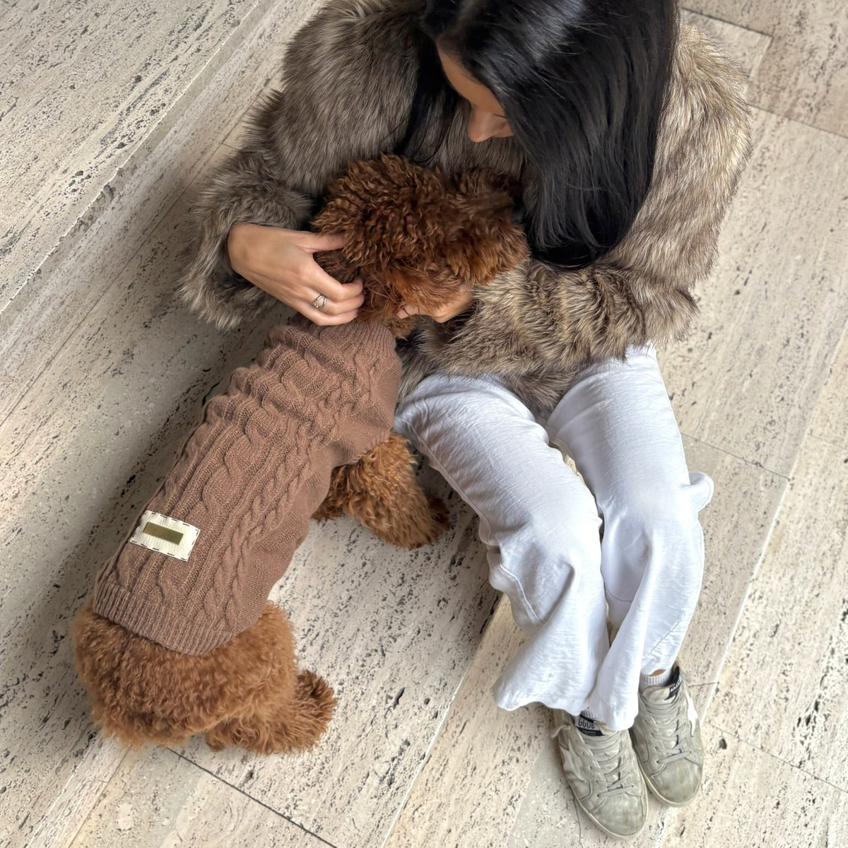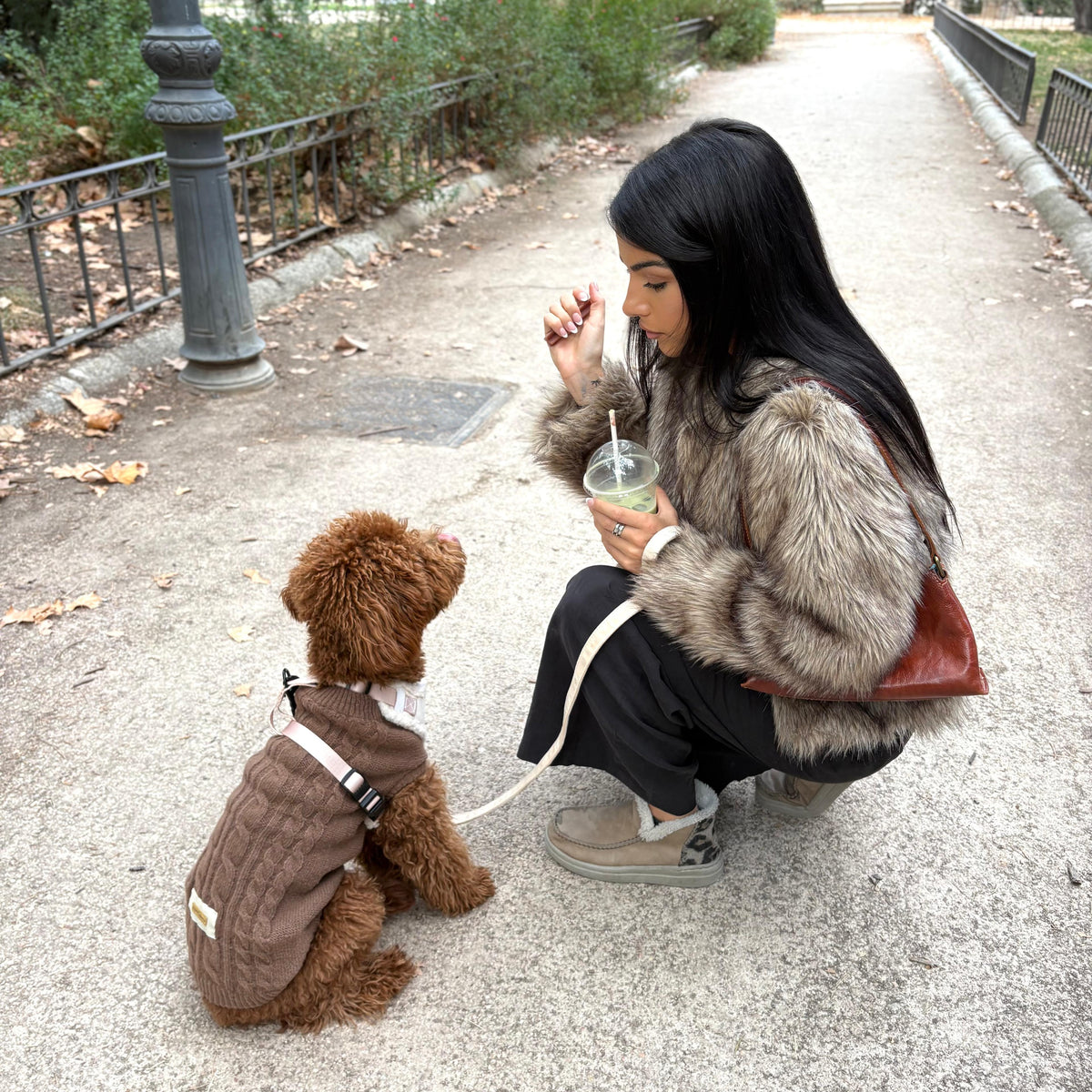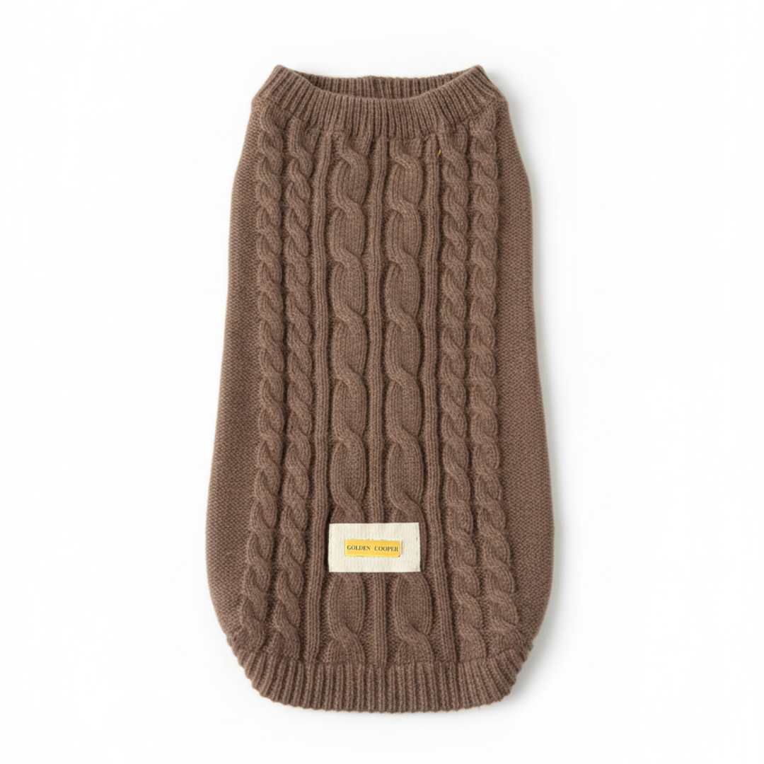 El "Golden Cooper" es un jersey de punto de alta calidad con un atemporal patrón de punto trenzado en un tono marrón cálido. Su diseño asegura un ajuste cómodo que no restringe el movimiento de tu mascota.
