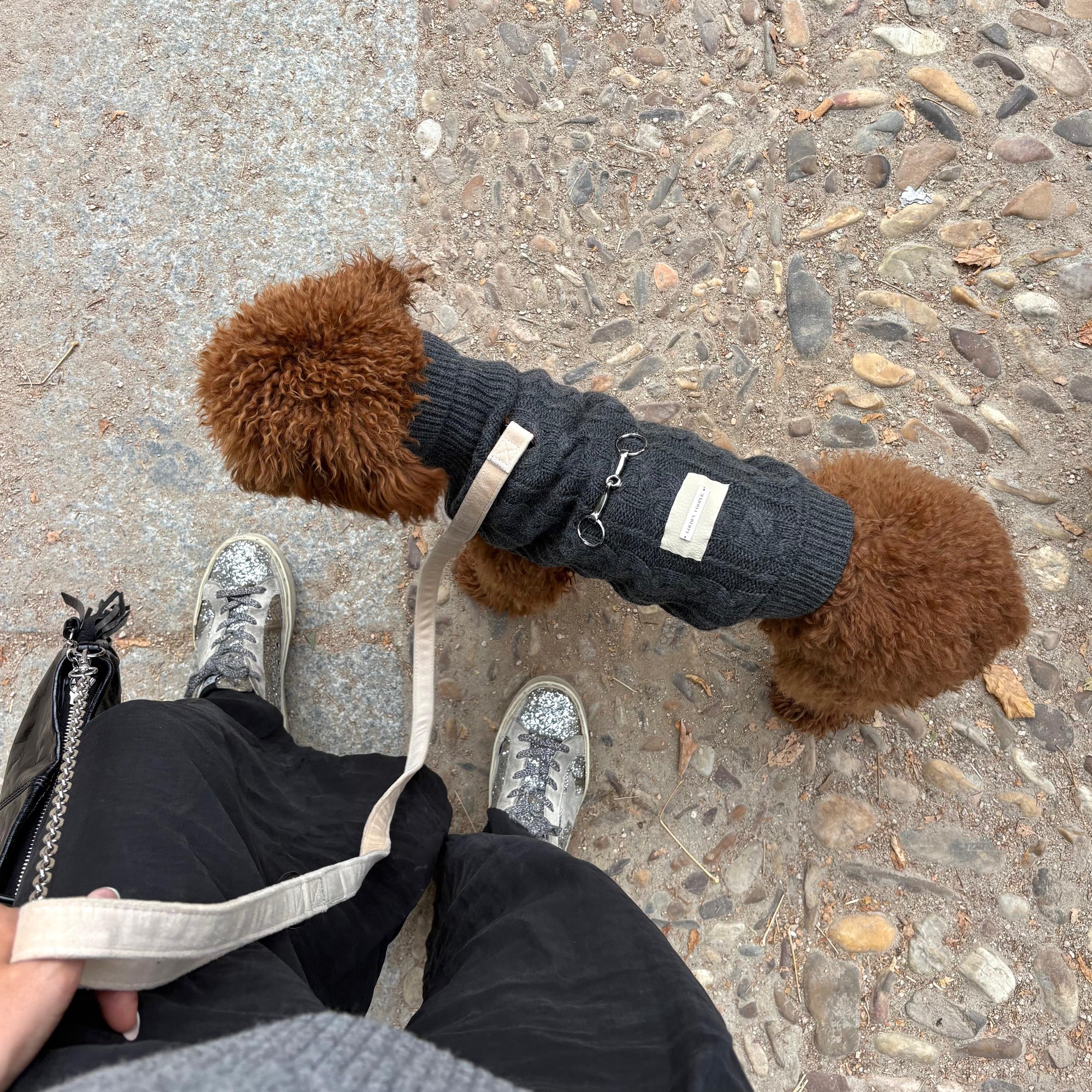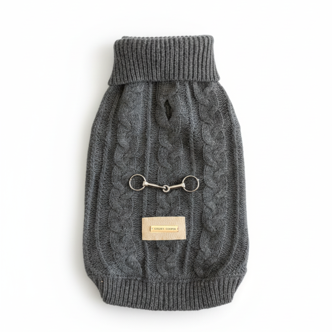 El "Zermat" es un jersey de punto grueso en un elegante color gris carbón, adornado con un clásico punto trenzado y un detalle de bocado ecuestre metálico. Su cuello alto ofrece protección adicional contra el frío.